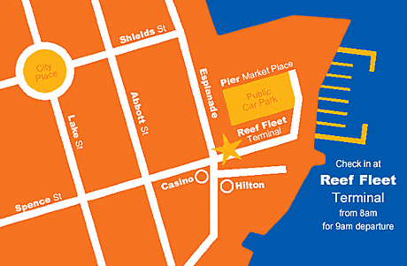 Reef Magic Cruises departs daily at 09:00am Check-in required BY 08:30am within: Reef Fleet Terminal (Marlin Wharf) 1 Spence Street Cairns-Waterfront Return hotel-coach transfers are available upon request as an option. Pick up times are advised upon confirmation of hotel/accommodation.